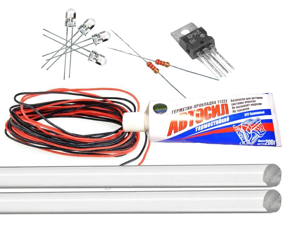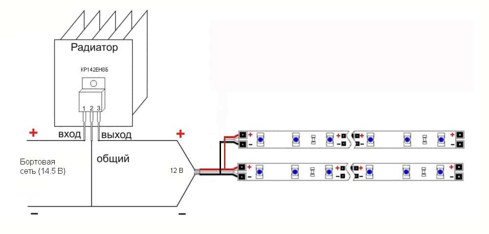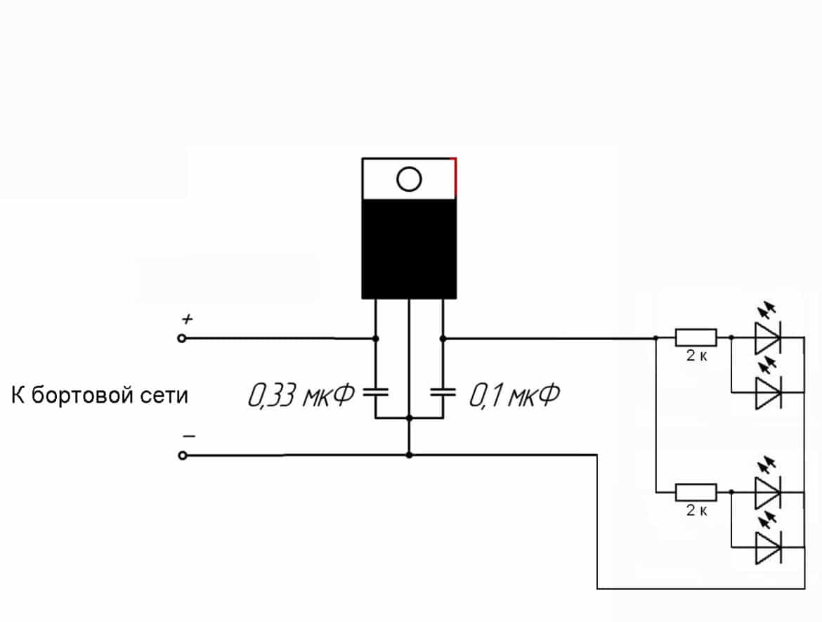 Vous pouvez sauver les yeux angéliques d'une manière ou d'une autre du lampat pour la ligne lumineuse (de manière optimale) et du mrezha bordeaux via une clé supplémentaire et prépositionnelle. Mais sur la lampe et dans la ligne bordeaux avec le moteur en marche, la tension a atteint 14,5 V, et vous avez besoin de 12 V. Envoyons un microcircuit - le stabilisateur KR142EN8B - à l'intégriran. Le schéma de connexion à un produit domestique avec un tuyau et deux LED est le suivant :