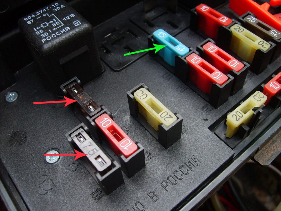 Est-ce que tout est prêt? Bloc de montage Montiram sur la viande. Passons maintenant à la préposition. Je m'intéresse à cela depuis le tezi, koito sa marquant les flèches sur l'instantané en bas. Flèche Zelenata du marqueur prépayé, total pour deux PTF. Toy e installé initialement, ty kato zahranva autres chaînes dans la voiture. La valeur nominale de la résistance est de 10 A, mais je peux aussi la remplacer par cinq dizaines d'ampères, donc une fois installé sur le phare, pour un nat brumeux, il n'est pas possible de l'augmenter. Les flèches rouges indiquent la prépasitelite, la dissuasion pour le lyavat et le dyasnat fara pour l'obscurité. Au départ, peut-être qu'ils ne tiennent pas debout - sur le farov kolata nyamasha. Il existe un montirame de prépositions avec une valeur nominale de 7,5 A.