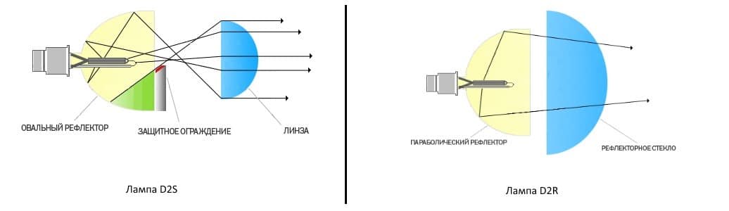 La principale différence entre la source de lumière D2S et D2R est la présence d'un préfabriqué de protection et d'un réflecteur ovale dans le phare, qui concentre le flux lumineux, en remplaçant l'objectif, et en mettant les phares pour les besoins du phare. Ci-dessus, allumez la lampe D2R, destinée aux réflecteurs paraboliques, elle est spécialement revêtue (représentée en noir sur la figure), une partie agissant comme un masque absorbant la lumière, une partie formant une lumière humide.