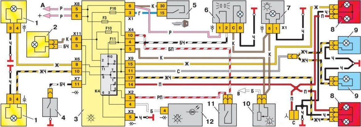 Le relais du contrôleur fonctionne correctement sur la page lumière - en cas de dysfonctionnement de l'une des lampes ou des chaînes, donnez alors une commande au système de contrôle bourgogne 12 et allumez le voyant d'avertissement, situé sur le panneau de renfort. La trace de l'interruption n'est pas relayée, au préalable, lors de sa soumission, page claire lignes 1 et 8.