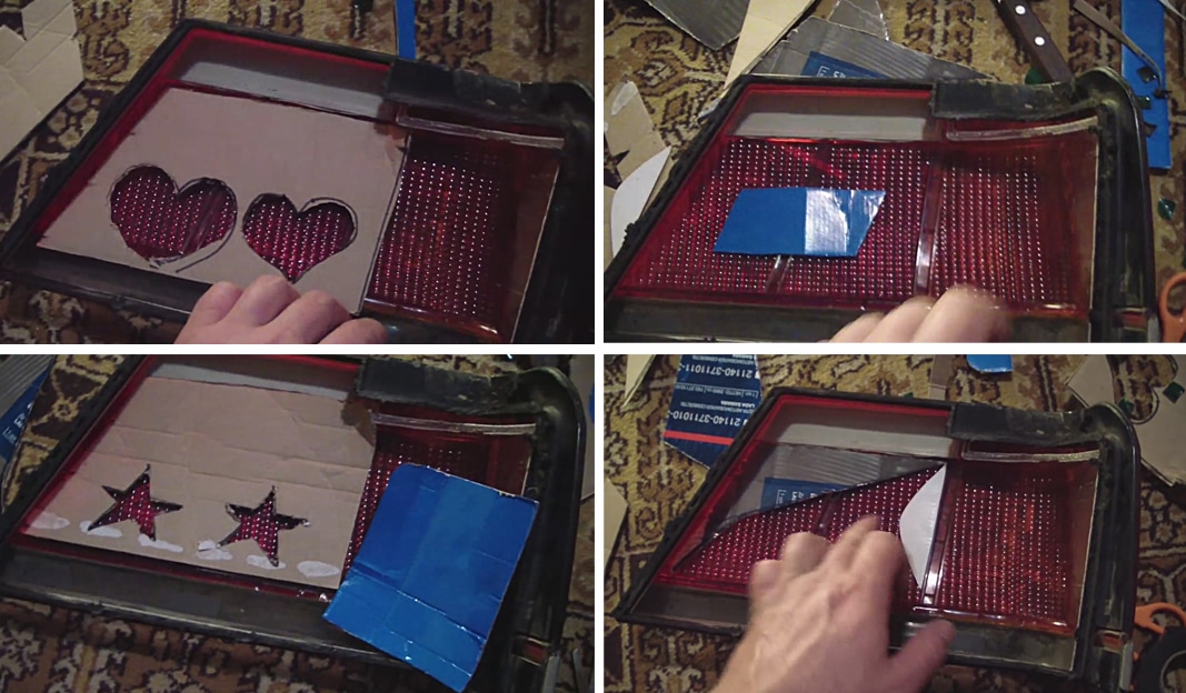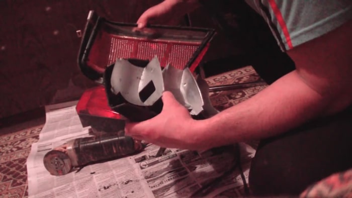 L'essence de la méthode est traçable: à partir du débel, le carton est déchiré en morceaux, répétant un peu la taille du voyant sur une page de lumière. Selon le principe de chaque lampe du VAZ 2115, il existe deux visionnaires de ce type, mais nous en dirigerons également un sur deux, ce qui coupera la barrière en aluminium, divisant le haut du réflecteur en boîtiers.