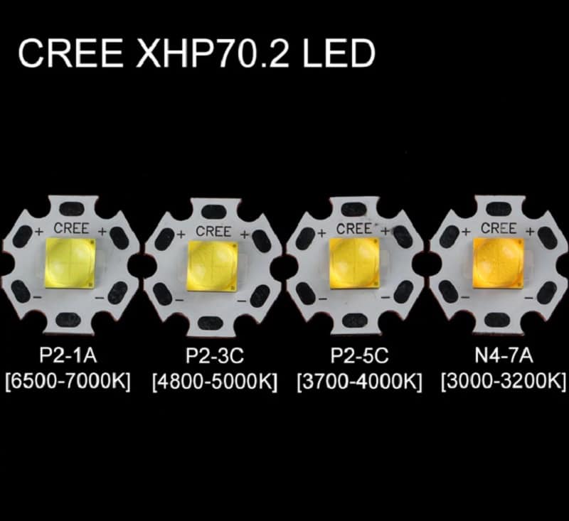 Certaines des LED les plus puissantes appartiennent aux séries XHP et XML, produites par Cree.Ceux-ci sont différents des chiffres record en matière de puissance et de luminosité. Certains modèles modernes utilisent des LED XHP70.2 et XML-2, qui offrent de bonnes performances. Pour les modèles avec des spécifications de luminosité inférieures, des LED XPG / XPE sont utilisées.