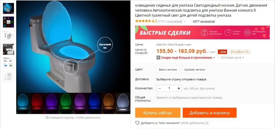 Dans le magasin sur Aliexpress ou Girbest, vous pouvez choisir le produit sous le nom "Toilettes automatiques avec éclairage lumineux LED".Le prix de mu varira est de 5 à 10 et plus d'un dollar, en fonction du prix de livraison et de la disponibilité des otstupki.