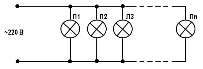 Avant d'arrêter l'installation, nous allons dessiner un schéma pour l'avenir des guirlandes. Ta lampe kato izbrahme pour la tension de travail 220 V, nous câblerons en parallèle.