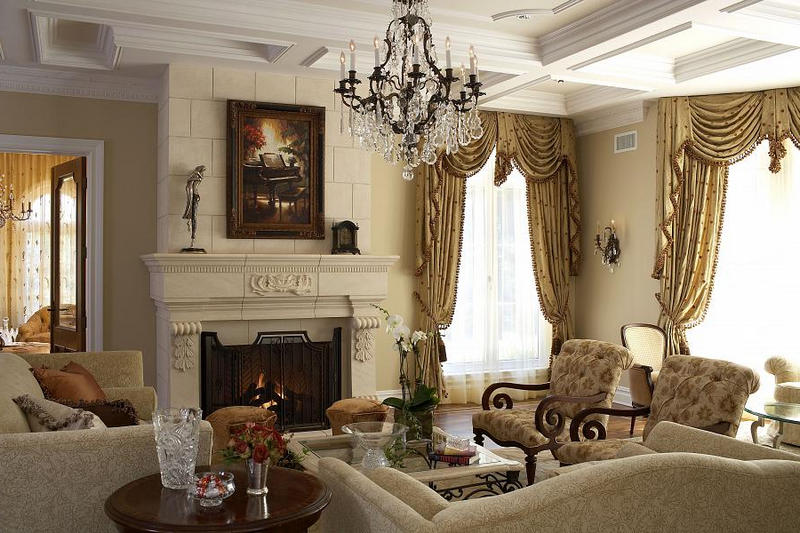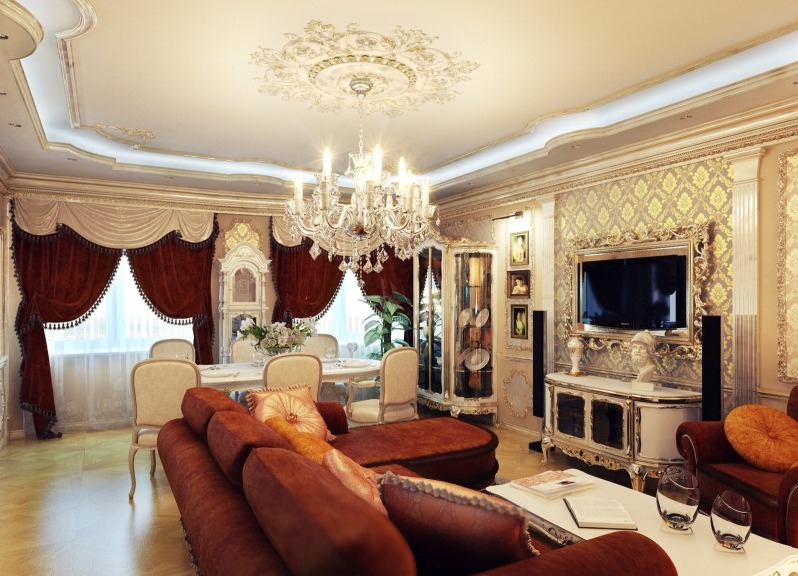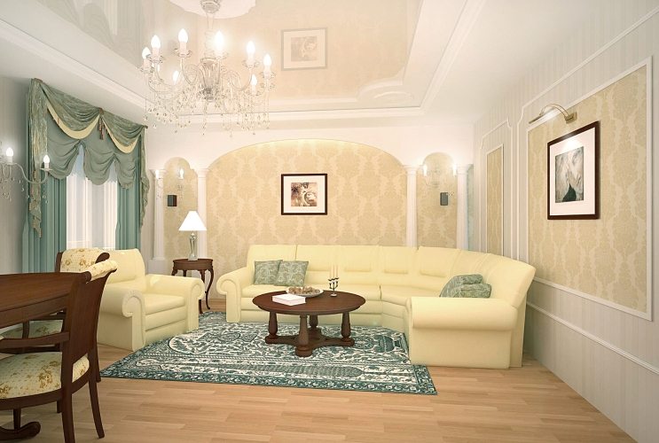 Pour oui, vous créerez une salle classique, treabva et comprendrez une combinaison harmonieuse de polyleys, de rideaux, de meubles et de revêtements de sol.