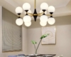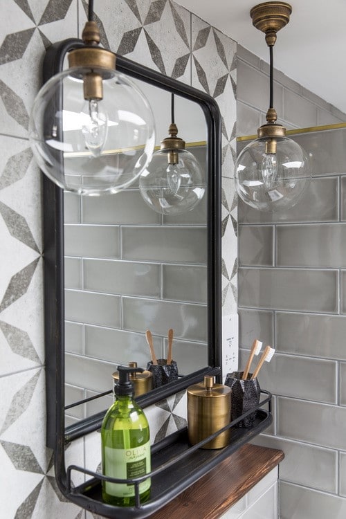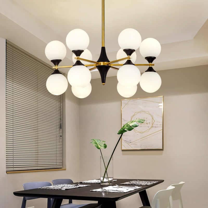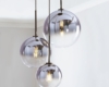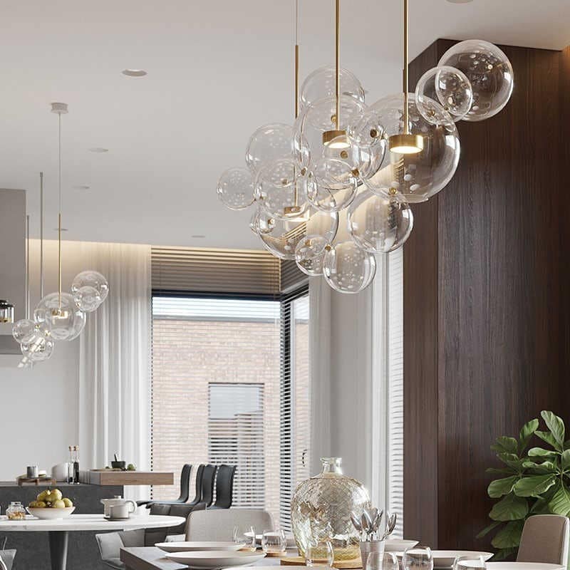 - Dans la cuisine, l'éclairage avec des abat-jour ronds en verre crée une ambiance cosy.