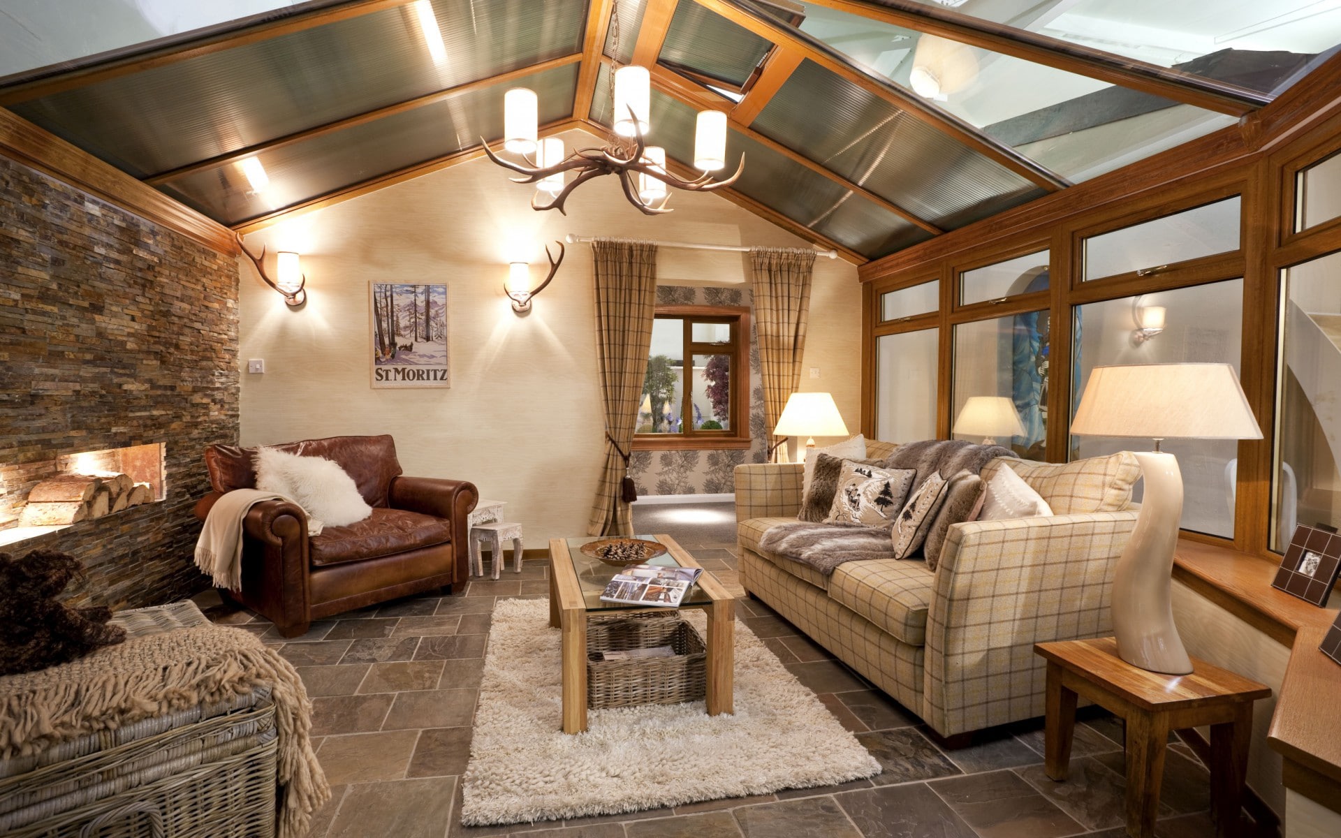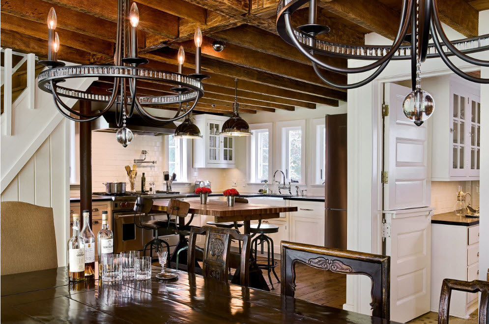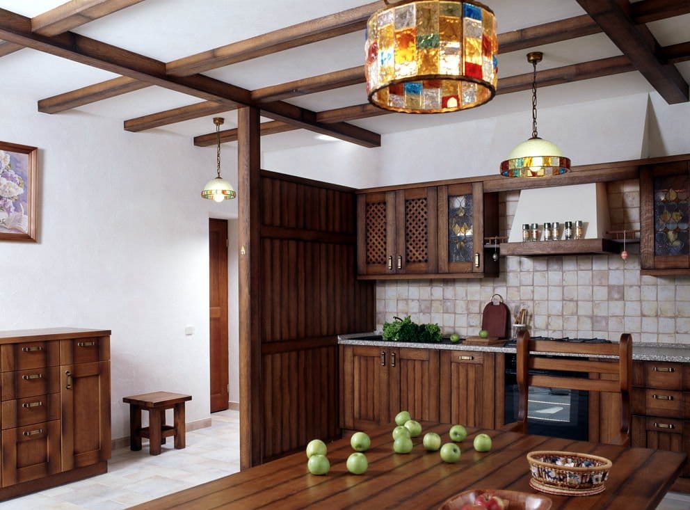 Lorsqu'il est développé sur un modèle rural, il est activement utilisé dans le bois, le verre, les textiles et les forges décoratives, le transformant en quelque sorte en un accent mis sur le produit. Oui, si vous voulez décorer une vila de village dans un style rural, mais un tel intérieur, oui, n'ayez pas l'air banal, préporchvame et regardez-le près de polyleite, qui utilisera des vitraux (technique de Tifani). Ceux-ci seront également un merveilleux ajout à la pièce ou à la cuisine.