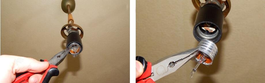 Technicien de conception et d'assemblage, retirez approximativement la cathothèse pour la cartouche E27, le moindre des fils dans la fente - lampata sevarva prez ouverture droite sur la fente directement en contact avec la coupe sur l'insert. La principale méthode de fixation sur une telle cassette consiste à l'ouvrir avec un filetage dans un ruban, vissé sur la came.