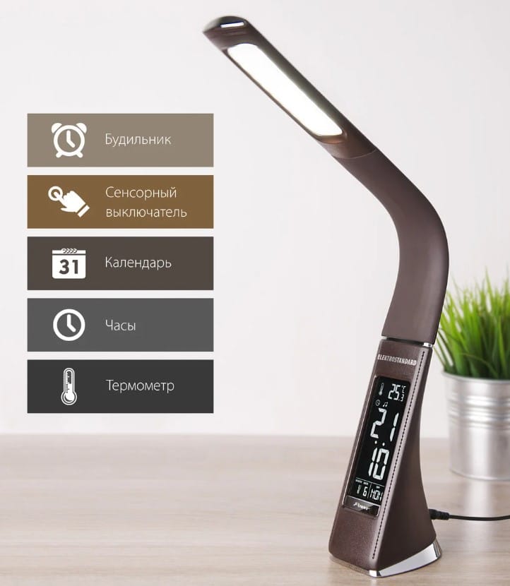 En plus des tâches de base, une sorte d'équipement de lampe de bureau avec des fonctions supplémentaires. Dnes e forest oui entend ici une lampe de table avec un horloger vgraden, un thermomètre, un calendrier.