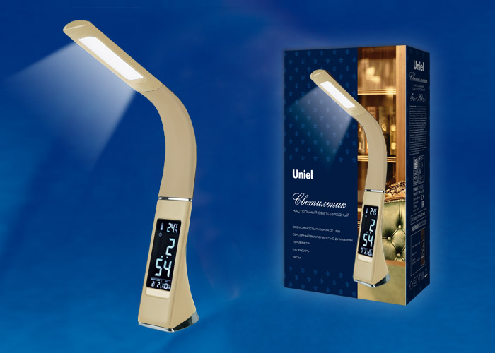 La lampe de table LED Uniel avec horloge, calendrier et thermomètre est idéale pour le bureau. Le modèle est proposé en 3 coloris : beige, kafyav et noir.