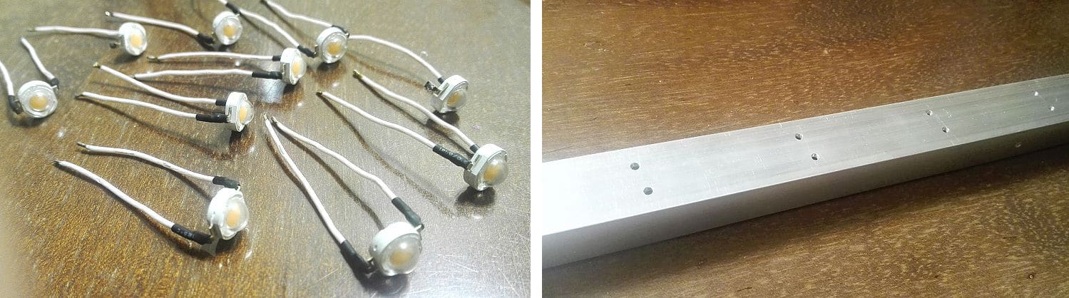 Préparons les LED. Rédigez une conclusion, conduisez un ivrogne, isolez un endroit pour une soudure avec un tube thermorétractable. Casser les creux sur la largeur du conducteur jusqu'au mur du mur au kutiyat, laissant la plantation de viande pour l'unité des côtes, que nous clôturerons dans le troisième.