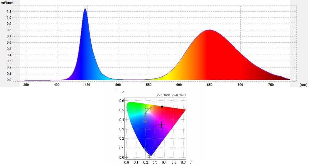 Les caractéristiques spectrales de la LED avec un spectre complet couvriront la zone, peu importe ce qui vous intéresse, mais la caractéristique est toujours typique. L'image peut être différente lorsqu'elle est utilisée sur des appareils de différents fabricants.