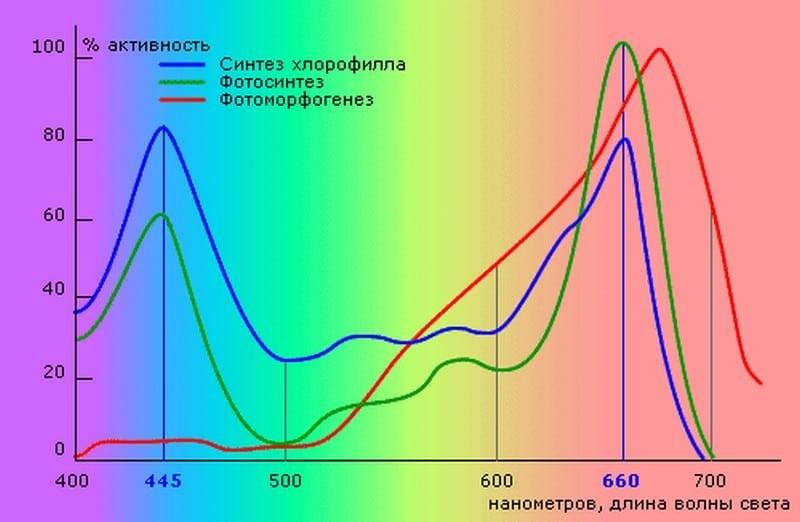 Par conséquent, lorsqu'ils poussent sur des plantes, ils utilisent des lampes, auquel cas le pic principal du spectre de luminescence tombe au sommet du rouge 660 nm et du bleu 440 nm.