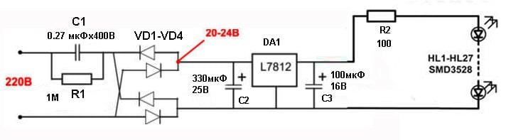 Sur le bassin, le schéma montre le veche de savoir éteindre (ballast) le condensateur, shunter par sécurité avec une résistance.Osvent tova fournit de manière préventive un pont de correction de courant, éliminant le condensateur avec une capacité offensivement petite - 10 μF elle-même - et via une résistance de limitation de courant, alimentant un câble à partir de la LED.