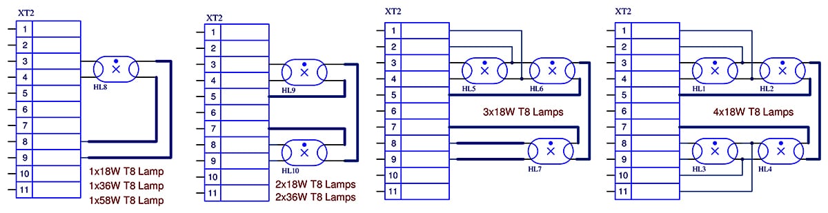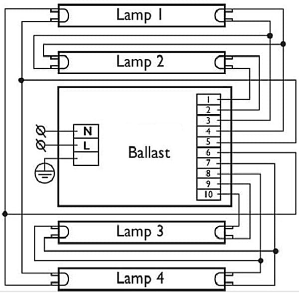 Le schéma pour connecter deux lampes à un seul starter est le suivant (la puissance du starter est de 36 W et la lampe est de 2 × 18 W conditionnellement):