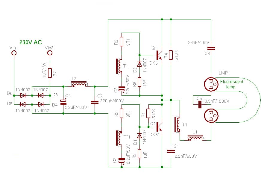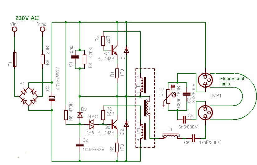 L'intertension est corrigée à partir du pont de diodes D3-D6 et est supprimée du condensateur haute tension C4. Les interrupteurs de préfiltre L2, C7, qui protègent le générateur de blocage, sont connectés aux transistors Q1, Q2 et au transformateur T1. La fréquence de travail du générateur est généralement de 10 à 20 kHz. Tension pulsée, prélevée sur l'enroulement T1, en appliquant la pres- t de l'inductance L1 pour cathoder les conducteurs sur le tube fluorescent LMP1. Répétez l'échappement sur la cathode avec la connexion à travers le condensateur C5.