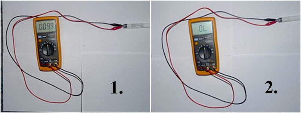 La bague de commutation du multimètre est réglée sur la position pour la mesure de résistance. Il est nécessaire de sélectionner une bordure ni-niskat sur la mesure (Ώ) ou de mettre l'interrupteur en position de vérification d'un signal sonore constant. Attachez les câbles de mesure et reliez-les à l'électrode. Appelez le lampat. Alarme sonore ou lectures d'instruments, différentes de bezkranostt, montrant l'intégrité de la spirale. Vous pervertirez comme les actions de la deuxième spirale. Ako moniteur sur l'appareil pour montrer l'état de "chupvane" ou émettre un signal, ne l'allumez pas, la lampe ne fonctionne pas tout le temps. Vous pouvez, oui, expérimenter et "allumer" dans le ballast d'une lampe.
