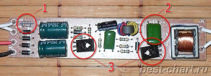 Predpazitelyat, hors du condensateur et le transistor échoue souvent, ce sont les indications sur la figure.